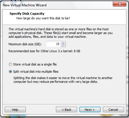 6. Dan atur harddisknya menjadi 13 GB dan pilih "split virtual disk into multiple files"