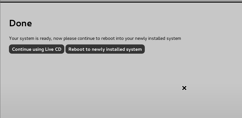 14. instalasi selesai , langsung klik "reboot to newly installed system"